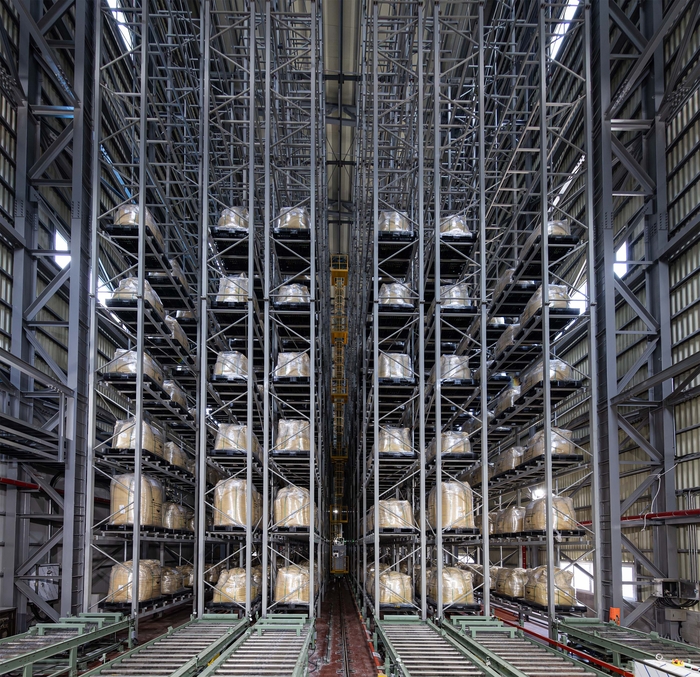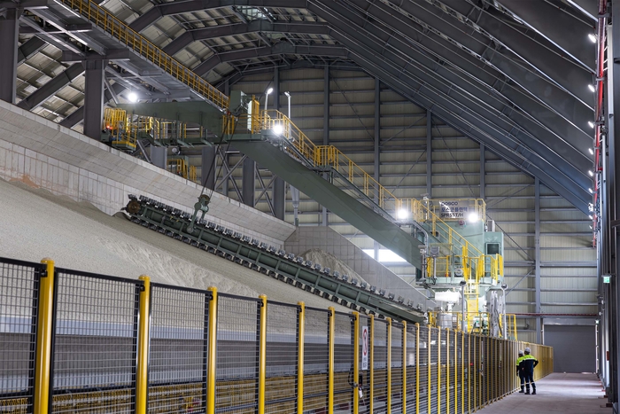 포스코필바라리튬솔루션에서 생산한 수산화리튬 제품 창고 전경<포스코홀딩스> 이날 방문한 포스코필바라리튬솔루션의 원료창고에는 호주에서 들여온 리튬광석 원료가 사막의 모래산처럼 높이 쌓여있었다. 원료창고에 보관되는 원료는 공장으로 옮겨져 황산과 혼합 과정을 거쳐 황산리튬 용액으로 바뀐다.