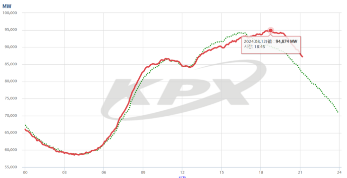 전력거래소에 따르면 이날 오후 7시 최대 전력수요는 94.48기가와트(GW)로 올 여름 최고 기록을 세웠다. 종전 올 여름 최대 전력수요는 지난 5일 93.84GW 였다.