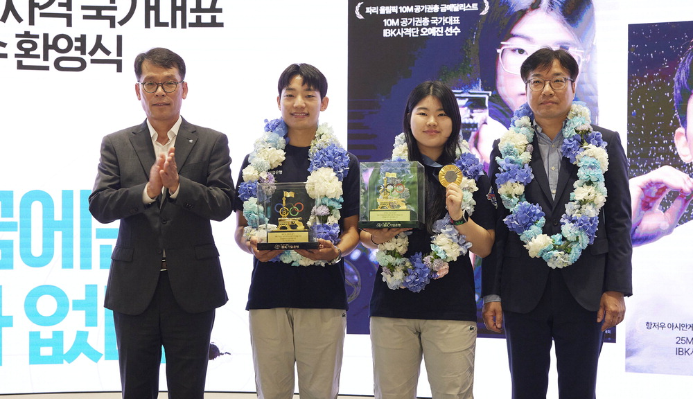 IBK기업은행이 14일 2024 파리올림픽에 출전했다가 귀국한 기업은행 사격단 소속 선수와 감독을 환영하는 행사를 열어 포상금과 격려품을 전달했다. 오예진 선수는 여자 10m 공기권총에서 금메달을 땄다. 이날 환영식에서 김성태 기업은행장,송종호 선수,오예진 선수,채근배 감독(왼쪽부터)이 기념촬영을 하고 있다. IBK기업은행