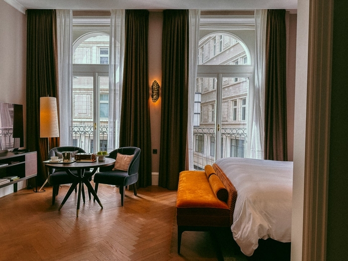 로즈우드 비엔나 / 사진=권효정 기자 객실은 오스트리아 직물 예술의 정수가 깃들어 있다. 발을 디딘 순간,1920년대 빈의 황금기에 있는 듯하다. 1849년 설립된 백하우젠(Backhausen)의 빈 유겐트 양식(Wiener Jugendstil) 패턴 직물이 곳곳을 장식한다. 커튼,의자,티슈 상자,침대 옆 메모장까지 19세기 말~20세기 초 오스트리아를 휩쓴 아르누보의 현지식 해석을 보여준다.