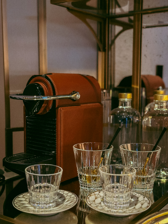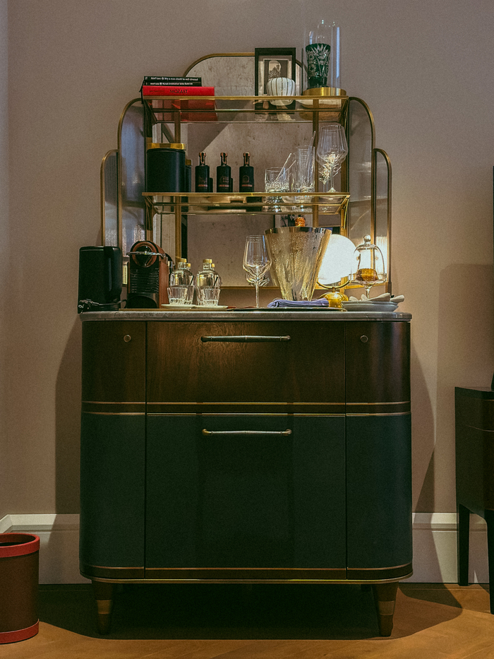 호두나무,가죽,현지 대리석으로 빚어낸 미니바 / 사진=권효정 기자 대담한 색채,고급 소재,금속 장식으로 클래식한 분위기를 연출하는 아르데코 스타일의 가구가 돋보인다. 호두나무,현지 대리석으로 빚어낸 미니바가 고급스러운 인상을 남긴다.