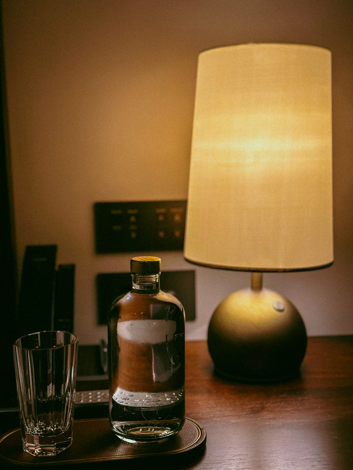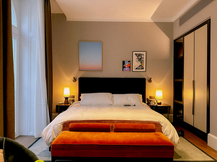 객실 내부와 침대 / 사진= 권효정 기자 창가의 벨벳 소파는 편안함의 극치를 보여준다. 청동빛 커튼이 감싼 거대한 창은 아트리움과 거리의 활기를 한 폭의 그림처럼 담아낸다. 호화로움을 넘어 예술의 경지에 다다른다.