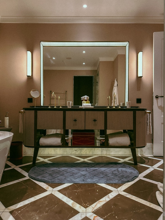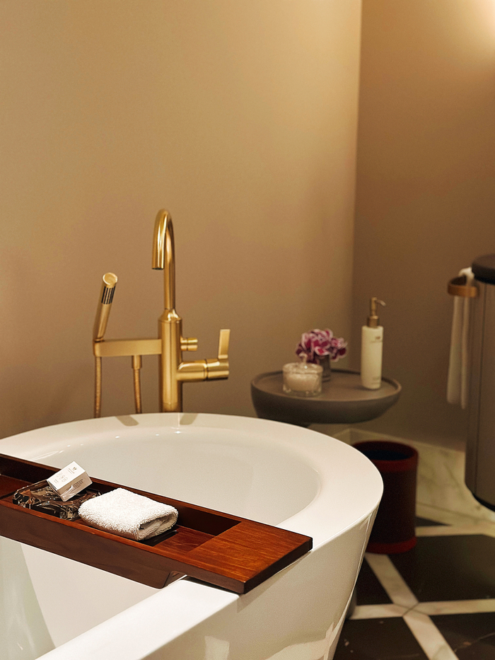 욕실 내부 / 사진=권효정 기자 넓은 욕실은 그 자체로 럭셔리의 정수를 보여준다. 흑백 대리석 타일이 그려내는 모노톤 바닥은 존재감을 뽐내고 깊이 있는 욕조는 사색에 잠기기 좋은 은신처가 된다.