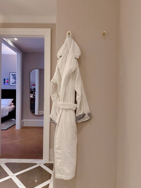 욕실에 걸려있는 로브 / 사진=권효정 기자 모차르트의 영혼이 깃든 공간이 럭셔리와 만나 새로운 생명을 얻었다. 투숙객은 과거와 현재를 잇는 다리를 건너며,모차르트의 창의성이 흐르는 공간에서 자신만의 이야기를 만들어갈 수 있다. 천재 음악가가 펜을 들었던 공간에서의 하룻밤은 특별한 영감으로 이어질지도 모른다. 이곳에서 당신도 인생의 걸작을 만날 수 있을지도 모른다.