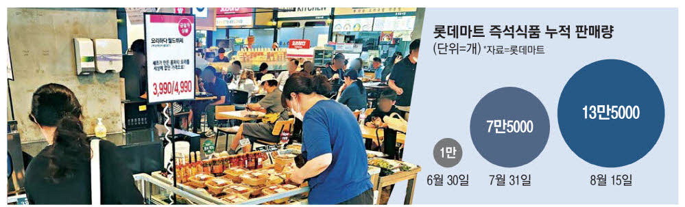 18일 유통업계에 따르면 롯데마트는 지난 6월 서울 제타플렉스 잠실점·서울역점,그랑그로서리 은평점 등 4개 점포에서 즉석식품을 사서 바로 먹을 수 있는 '요리하다 월드뷔페' 운영을 시작했다. 이달 15일까지 약 두 달(57일) 동안 6억원의 매출을 올렸다. 같은 기간 누적 판매량은 13만5000개를 넘어섰다. 회사는 지난달 17일부터 경기 의왕점,군산점 등 적용 점포를 늘렸다. 현재 27개 점포에 요리하다 월드뷔페를 도입했고,전 점포로 확대하기로 했다.