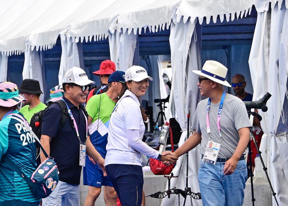 정의선 현대차그룹 회장이 지난 1일 파리 레쟁발리드 연습장에서 김문정 여자 양궁 대표팀 코치와 악수하고 있는 모습. 대한양궁협회