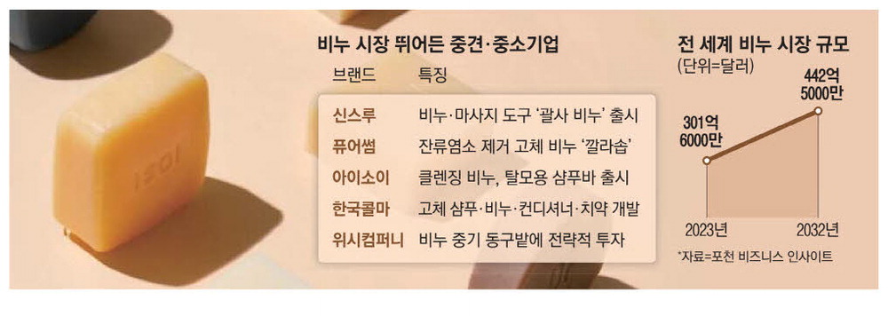 글로벌 시장조사기관 포천 비즈니스 인사이트에 따르면 세계 비누 시장 규모는 지난해 301억6000만달러에서 올해 312억5000만달러로 3.6% 증가할 것으로 예상된다. 2032년에는 442억5000만달러까지 커질 전망이다.