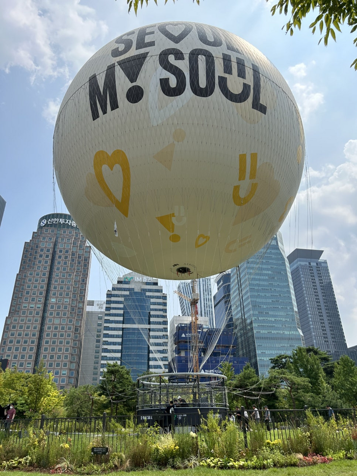 계류식 가스 기구 ‘서울달’ / 사진= 박한나 여행+ 기자 흔히 열기구하면 공중을 떠다니며 구름 속을 배회하는 튀르키예의 카파도키아 열기구가 떠오른다. 불을 지펴 양력으로 떠오르는 방식이다. 하지만 서울달은 일반적인 열기구와는 달리,헬륨가스를 이용해 부양한다. 이를 ‘계류식 가스 기구’라고 일컫는다. 서울달은 공기보다 가벼운 헬륨의 부력을 이용해 공중으로 떠오른 뒤 기구 밑에 달린 케이블을 따라 수직으로 비행한다. 일단 더운 날씨에 ‘열’로 떠오르는 기구가 아니라는 점에 한시름 놓았다.