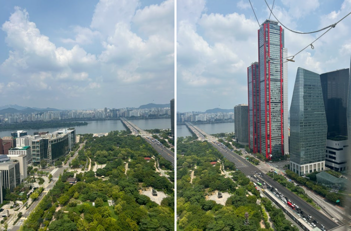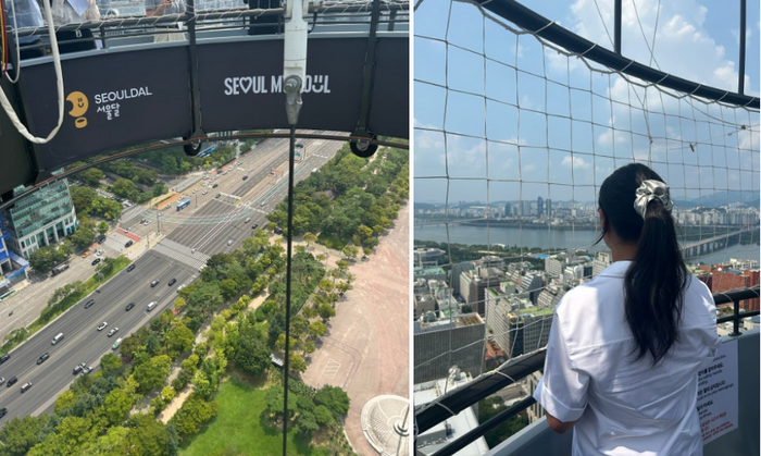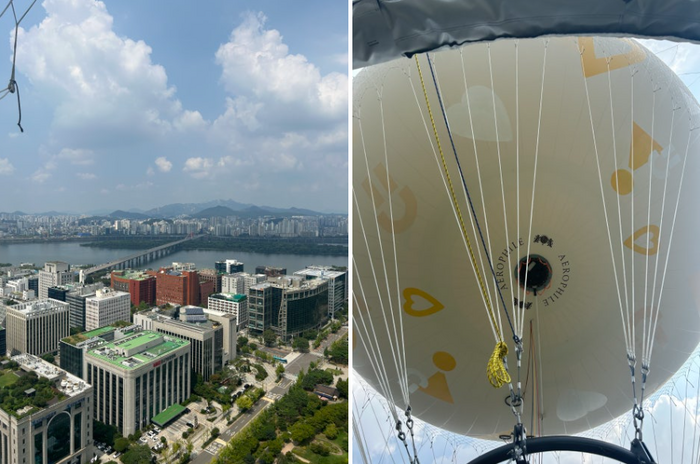 한강 전경(왼쪽),아래에서 바라본 기구(오른쪽) / 사진= 박한나 여행+ 기자 아름다운 전망을 구경하다 문득 아래를 내려다보니,안정적인 운행 덕분에 느끼지 못했던 높이가 새삼 실감이 난다. 탑승한 기구가 130m,자그마치 건물 43층 높이에 위치해 있다는 사실에 아찔한 기분마저 든다. 아래로 곤두박질치는 상상을 하던 참에,서울달의 안정성을 보장하는 파일럿의 안내가 들려온다.