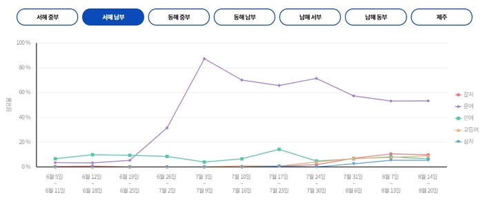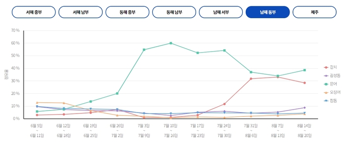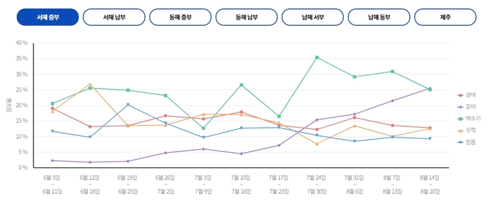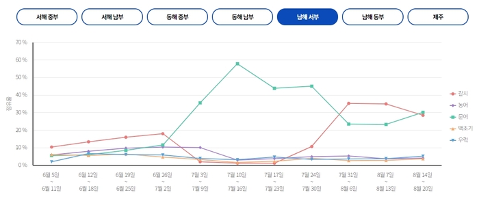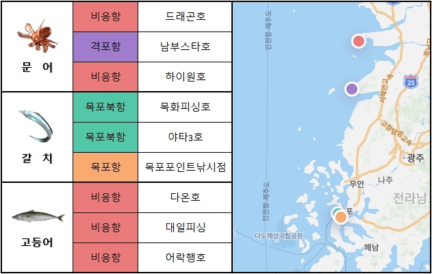 서해 중부 서해 남부에서는 비응항,목포북항,목포항을 중심으로 문어,갈치,고등어 출조가 활발하게 이루어지고 있습니다. 이번 주 출조 예정인 선박은 비응항에서 드래곤호,다온호,어락행호,목포북항에서 목화피싱호,야타3호,목포항에서 목포포인트 낚시점 입니다.
