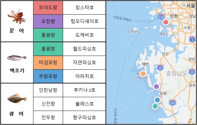 서해 중부 서해 중부에서는 오이도항,홍원항,진두항을 중심으로 문어,백조기,광어 출조가 활발하게 이루어지고 있습니다. 이번 주 출조 예정인 선박은 오이도항에서 킹스타호,홍원항에서 도깨비호,월드피싱호,진두항에서 짱구피싱호 입니다.