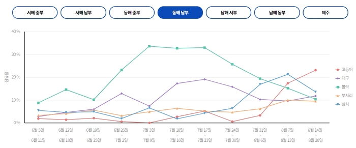 동해 남부 앞바다는 8월 31일 토요일 흐리고 파고는 1~2m 예상합니다. 9월 1일 일요일 흐리고 파고는 1~2m 예상합니다.