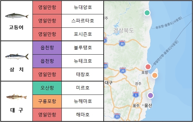 동해 중부 동해 남부에서는 영일만항,읍천항,구룡포항을 중심으로 고등어,삼치,대구 출조가 활발하게 이루어지고 있습니다. 이번 주 출조 예정인 선박은 영일만항에서 뉴대양호,태창호,해마호,읍천항에서 블루탱호,뉴테크호,구룡포항에서 뉴해마호 입니다.