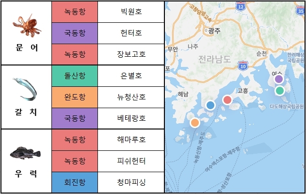 남해 서부 남해 서부에서는 녹동항,국동항,회진항을 중심으로 문어,우럭 출조가 활발하게 이루어지고 있습니다. 이번 주 출조 예정인 선박은 녹동항에서 빅원호,장보고호,피쉬헌터,국동항에서 헌터호,베테랑호,회진항에서 청마피싱 입니다.