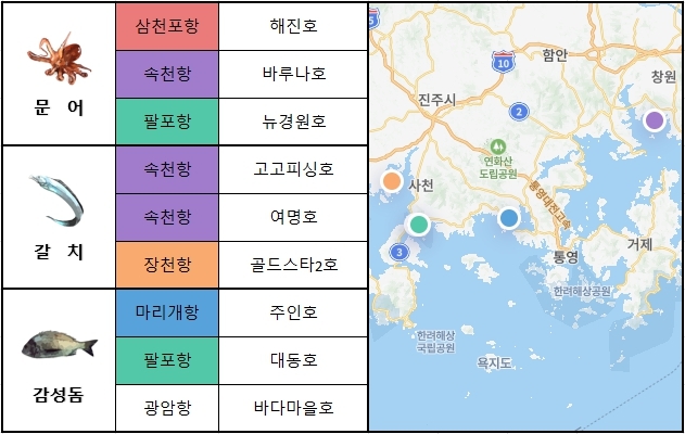 남해 서부 남해 동부에서는 속천항,팔포항,마리개항을 중심으로 문어,감성돔 출조가 활발하게 이루어지고 있습니다. 이번 주 출조 예정인 선박은 속천항에서 바루나호,고고피싱호,여명호,팔포항에서 뉴경원호,대동호,마리개항에서 주인호 입니다.