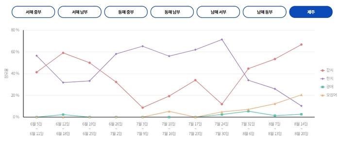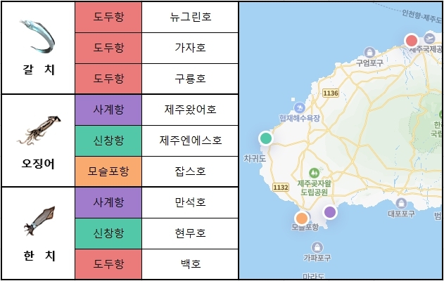 제주 제주에서는 도두항,사계항,신창항을 중심으로 갈치,오징어,한치 출조가 활발하게 이루어지고 있습니다. 이번 주 출조 예정인 선박은 도두항에서 뉴그린호,구룡호,백호,사계항에서 제주왔어호,만석호,신창항에서 제주엔에스호,현무호 입니다.