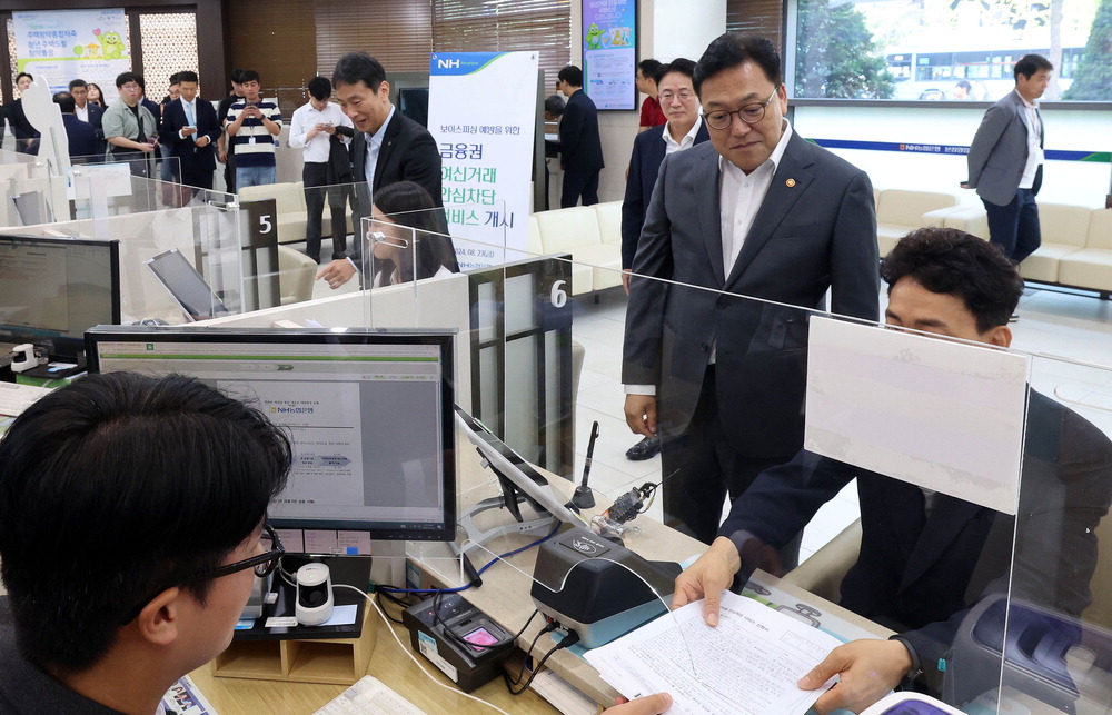 김병환 금융위원장(오른쪽 둘째)이 23일 이복현 금융감독원장과 함께 서울 중구 NH농협은행 본점영업부를 찾아 '여신거래 안심차단 서비스'가입 현장을 참관하고 있다. 이충우 기자