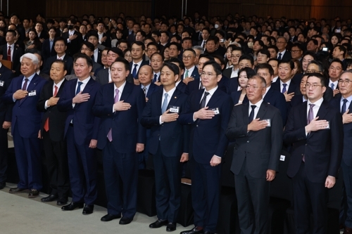 윤석열 대통령이 지난 3월 20일 서울 영등포구 63컨벤션센터에서 열린 제51회 상공의 날 기념식에서 기업인들과 함께 국기에 경례하는 모습. 앞줄 오른쪽부터 구광모 LG그룹 회장,정의선 현대차 회장,이재용 삼성전자 회장,안덕근 산업부 장관,윤 대통령,최태원 SK그룹 회장. 윤석열 대통령이 내달 체코를 방문할 예정인 가운데 삼성과 LG,SK 그룹 총수가 경제사절단으로 동행할 것으로 알려졌다.