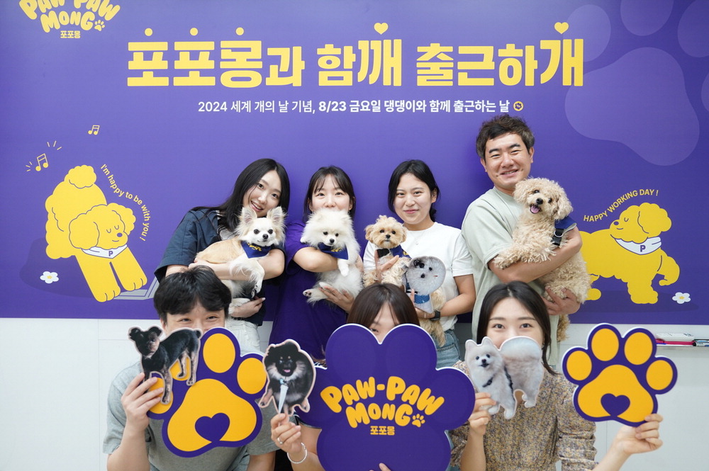 생활용품 전문기업 깨끗한나라가 26일 '세계 개의 날'을 맞아 서울 한남동 본사에서 강아지와 함께 출근하는 '포포몽과 함깨 출근하개' 행사를 개최했다. 반려견 동반 출근을 위해 직원과 반려견이 일할 수 있는 별도의 공간을 마련하고 반려견을 위한 장난감,간식,펫티슈 등도 준비했다. 깨끗한나라