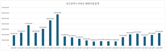 대구 아파트값은 지난 2016년 상반기 데드 크로스(단기 이평선이 장기 이평선을 뚫고 내려가면서 두 선이 교차한 지점) 전후해 약 1년 가까이 하락했고,2017년 하반기 골든 크로스 이후엔 2018년 말까지 평당 매매값이 927만원에서 1050만원으로 뛰었다. 1년새 무려 13%가 뛴 바 있다.