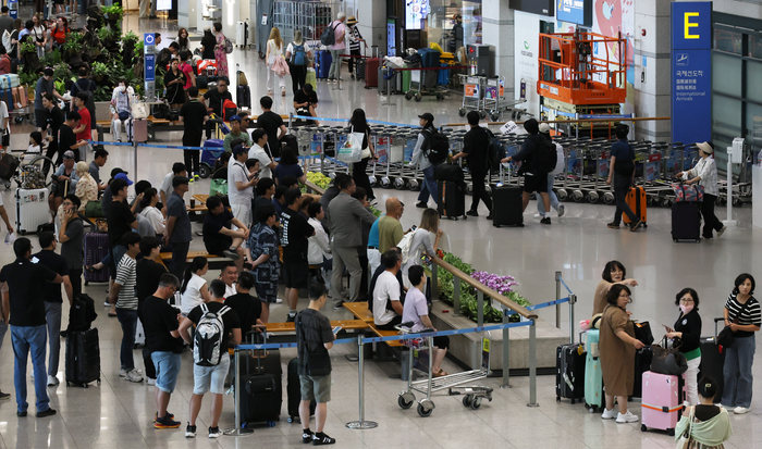 지난달 인천국제공항 1터미널 입국장이 휴가철 해외여행에서 돌아오는 여행객들로 붐비고 있다.[사진제공=연합뉴스] 정부의 국군의날 임시공휴일 지정 발표 이후 10월초 연휴에 해외로 떠나는 여행객들이 작년보다 증가했다는 통계가 나왔다.