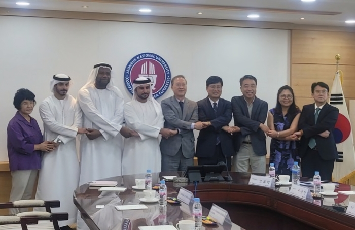 라스알카이마 경제특사단이 5일 전북대학교를 방문해 기념사진을 찍고 있다. 중동의 부국 아랍에미리트(UAE)의 7개 토후국 중 하나인 라스알카이마의 경제특사단이 한국방문 이틀째인 5일 다원 스마트팜의 양계농장과 전북대학교에 방문했다. 특사단은 관계자들과의 면담을 통해 다양한 협력 방안을 협의했다.