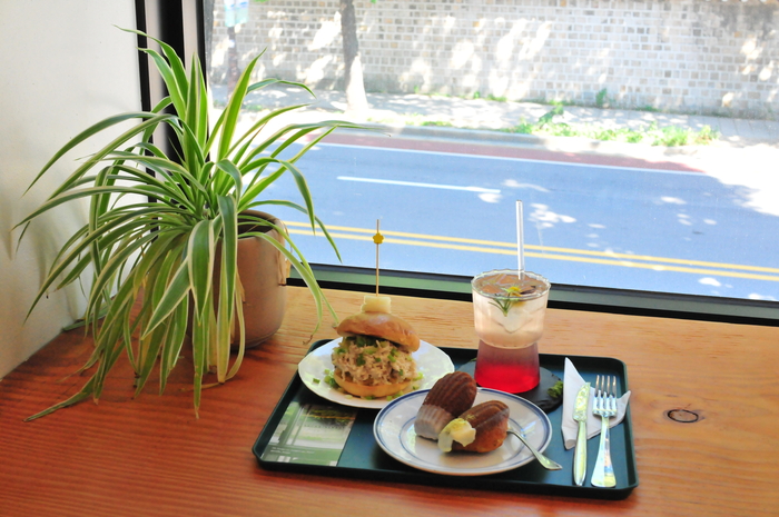 카페 보안 메뉴/사진=김지은 여행+ 기자 책방의 좌석은 1층 카페 보안의 메뉴를 주문하면 이용할 수 있다. 커피를 비롯해 여러 음료를 판매한다. 차 전문집인만큼 차 메뉴를 추천한다. 그중에서도 캐모마일 오미자차는 캐모마일 티와 직접 만든 오미자청을 섞어 상쾌하면서도 달콤하다. 가을과 겨울에는 직접 우린 잎차가 잘 나간다고. 전문 제빵사가 직접 만드는 디저트도 별미다. 배가 출출하다면 닭가슴살 브리오슈 번을 꼭 먹어보길. 바삭한 빵에 잘게 찢은 닭가슴살과 홀그레인 머스터드 소스,쪽파까지 올라가 풍미가 입안 가득 퍼진다.