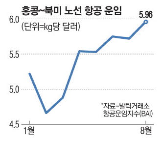 8일 항공업계에 따르면 발틱거래소 항공운임지수(BAI) 기준 지난달 홍콩~북미 노선 항공 화물 운임은 ㎏당 5.96달러를 기록했다. 이는 올해 저점을 보인 지난 2월(4.66달러) 대비 27% 높다.