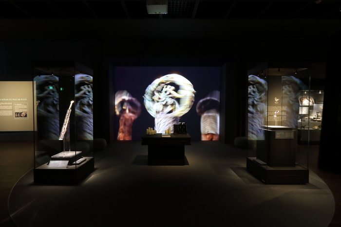 관람객이 특별전 ‘상상의 동물사전,백제의 용’전에 전시된 고리자루큰칼과 은팔찌에 새겨진 용의 영상을 관람하고 있다.