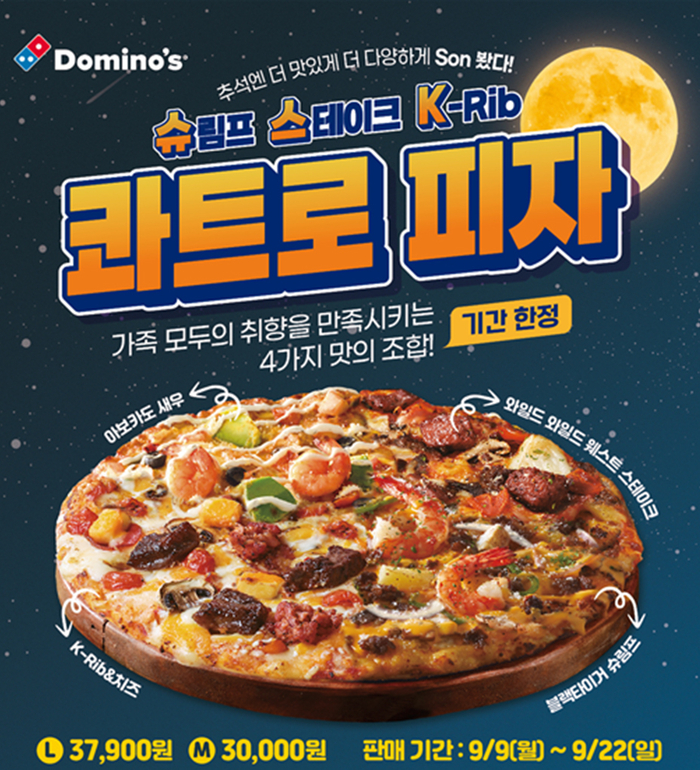 도미노피자 관계자는 “민족 대명절 추석을 맞아 도미노피자의 대표 프리미엄 메뉴를 한 번에 즐길 수 있는 슈스K 콰트로 피자를 출시했다”며 “올 추석에는 온가족이 함께 모여 도미노피자의 맛있는 피자와 함께 풍성한 한가위를 즐기시길 바란다”고 말했다.