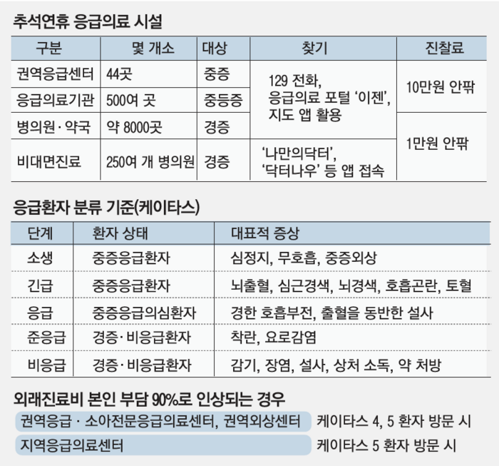응급실 연휴 정상 진료 안내문 놓인 병원 [사진=연합뉴스] 추석 명절을 전후로 비상응급 대응 주간이 2주간 운영되고 있는 가운데 13일부터 케이타스(국내 응급환자 분류 체계) 4·5에 해당하는 경증·비응급 환자가 응급실을 찾으면 진료비의 90%를 본인이 부담한다. 감기나 장염,설사 등 비교적 가벼운 증상을 보이는 환자들은 동네 병의원이나 작은 규모의 응급실을 먼저 방문해 진료받는 것이 필요하다. 중증응급환자를 위한 응급실도 407곳이 연휴 기간 내 매일 24시간 운영된다.