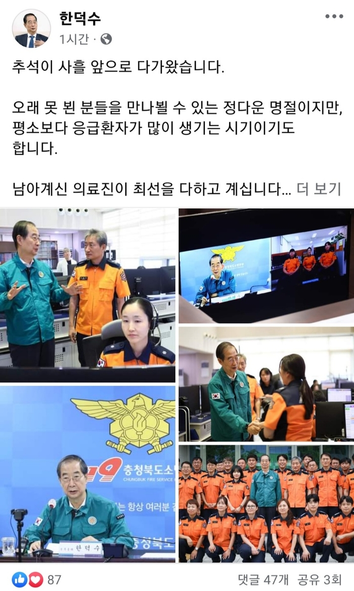 한 총리는 전날 충북소방본부 구급상황관리센터를 방문한 내용도 소개했다. 그는 “요즘 응급의료 현장을 지키는 분들을 만나 뵐 때마다 ‘영웅’은 이런 분들을 가리키는 말이구나 싶어진다”며 감사의 마음을 전했다.