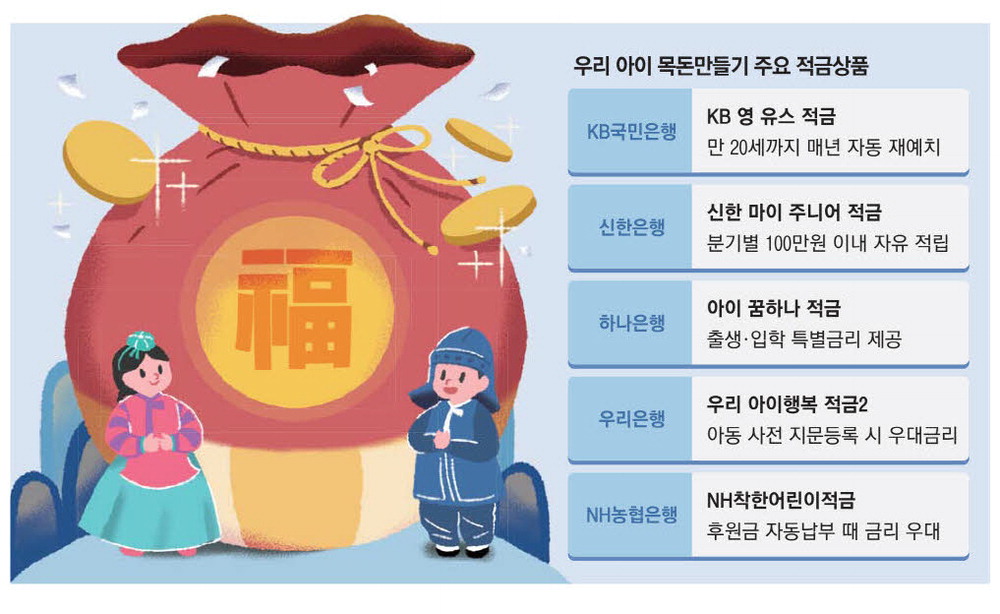 예전처럼 아이들로 왁자지껄했던 고향집 풍경은 점차 사라지고 있지만,몇 안 되는 아이들에게 추석 명절은 그래서 더 귀한 추억으로 남는다. 오랜만에 본 아이에게 친지들의 '용돈'이 쏟아지는 것은 덤이다. 이렇게 모인 귀한 돈을 마냥 허투루 쓸 수 없다. 재테크의 기본은 '티끌 모아 태산'이다. 어린 시절부터 꼬박꼬박 적금 붓는 습관을 통해 목돈을 만들어주고,이를 통해 성인이 된 이후 자립할 수 있는 기반을 만들어주는 것도 방법이다. 국내 주요 은행들은 이 같은 어린이 고객들을 위해 다양한 적금 상품을 선보이고 있다. 평생 고객을 유치하기 위한 기본 상품 중 하나가 어린이 적금이기 때문이다.