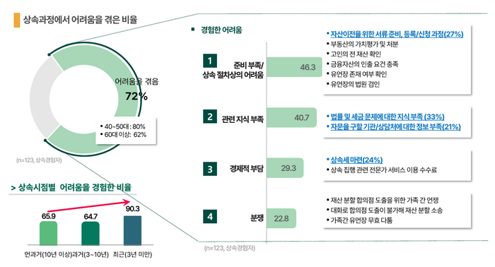 상속 경험자에게 상속 과정에서 어려움이 있었는지 조사한 결과 70%가 어려움을 겪은 것으로 나타났다. 가족 간 재산 분할 분쟁(23%)보다 상속에 대한 준비 부족과 상속 절차상의 어려움(46%),법률 및 세금 문제에 대한 지식부족(41%),상속세 등 경제적 부담(29%)이 어려움의 주된 원인이었다.
