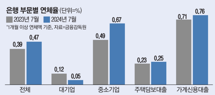 특히 올해 7월말 개인사업자(자영업자) 대출 연체율은 0.61%로 2년전 0.17%와 비교해 3.6배 뛰었다. 취약 차주를 중심으로 연체율이 늘어나면서 국내은행의 전체 연체율도 2022년 7월 0.22%에서 작년 7월 0.39%,올해 7월 0.47%로 상승세를 이어가고 있다.