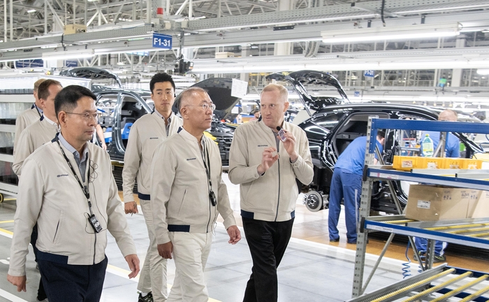 정 회장은 이날 현지 생산시설을 점검하고 유럽사업 현황을 보고받았다. 이어 현대모비스 배터리시스템(BSA) 공장을 둘러보고 현지 임직원들과 오찬을 함께 했다. 현대차그룹에 따르면 정 회장은 이날 한국 추석 연휴에도 해외에서 맡은 바 역할을 다하고 있는 현지 임직원들의 노고를 격려했다.