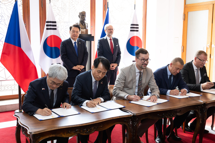 윤석열 대통령과 페트르 피알라 체코 총리가 20일(현지시간) 프라하 체코 정부청사에서 열린 한·체코 국책금융기관 간 5자 금융협력 MOU 체결식에서 윤희성 수출입은행장(앞줄 왼쪽),장영진 무역보험공사 사장(왼쪽 두번째)과 체코 국영개발은행,수출은행,수출보증보험공사 대표자들이 서명하는 동안 임석하고 있다. 연합뉴스 한국수출입은행과 무역보험공사가 체코의 국책금융기관과 다자간 업무협약(MOU)을 체결하고 양국 기업이 상호 국가에 진출시 금융지원 등을 하기로 했다.