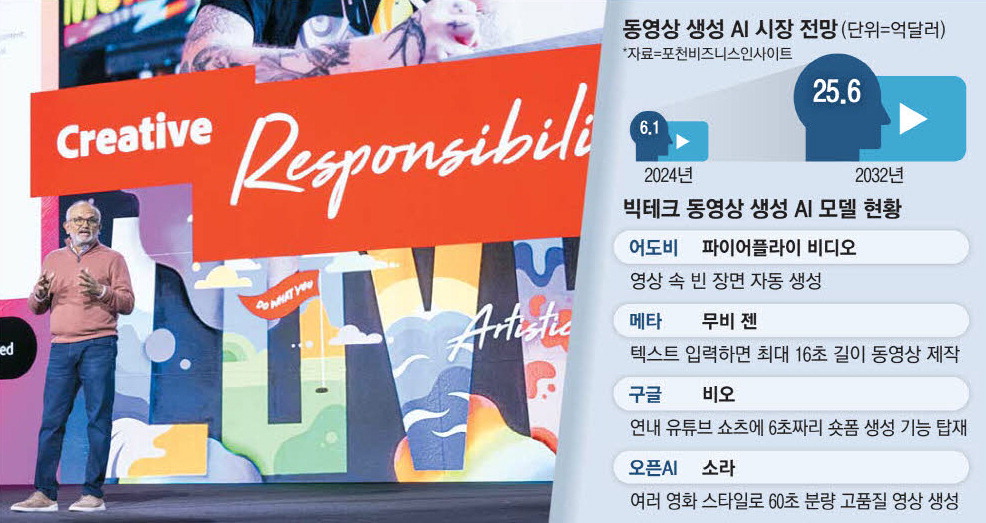 포토샵으로 유명한 콘텐츠 제작 소프트웨어(SW) 전문기업 어도비가 자사의 생성형 인공지능(AI) 모델군 '파이어플라이'로 구동되는 동영상 AI를 전격 공개했다. 지난해 텍스트를 이미지로 변환해주는 이미지 AI를 내놓아 호평을 받았던 어도비는 신규 AI 서비스를 통해 오픈AI·구글,메타 등과 벌이는 동영상 AI 경쟁을 본격화할 계획이다. 샨터누 너라연 어도비 최고경영자(CEO)는 14일(현지시간) 미국 플로리다주 마이애미에서 열린 세계 최대 규모 크리에이티브 콘퍼런스 '어도비 맥스 2024'(Adobe MAX 2024) 무대에 올라 "어도비는 생성형 AI가 지닌 잠재력과 이것이 (창작자들을 지원할) 강력한 가능성으로 발현되고 있다는 것을 인지하고 지원에 앞장서고 있다"고 밝혔다. 어도비 맥스는 사진작가와 영상 제작자 등 크리에이터들을 위한 행사로 올해 1만여 명이 참여했다.
