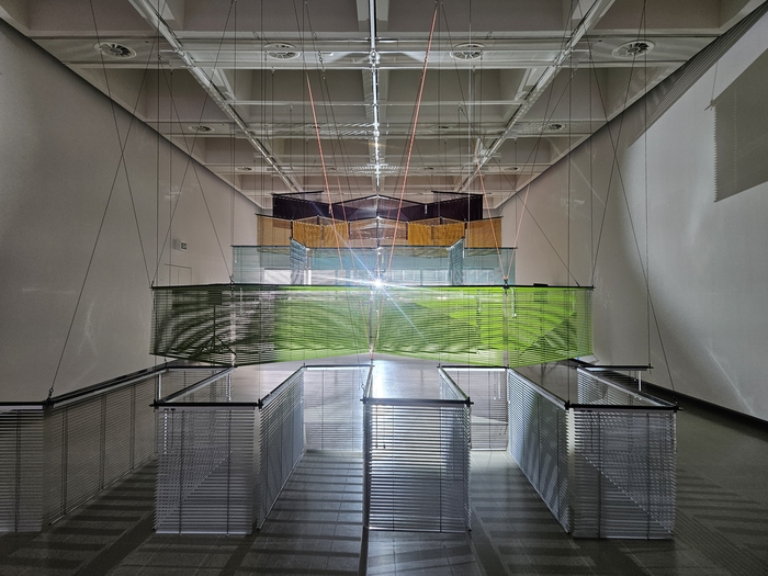 양혜규 ‘윤에 따른 엇갈린 랑데부’(2024). 반체제 작곡가 윤이상의 ‘이중 협주곡’(1977)을 모티브로 한 블라인드 설치 작품이다. 런던 송경은 기자 블라인드와 형광등,빨래 건조대,행거,싱크대…. 일상에서 흔히 사용하는 가정 용품들이 영국 런던 한복판의 한 전시장을 가득 메웠다. 블라인드는 창문이 아닌 천장과 바닥에 있고,싱크대는 벽면에 그림처럼 걸렸다. 블라인드로 가린 건 햇빛이 아닌 백색 전구의 빛. 뜨개실,전통 한지 등 한국의 정취가 담긴 물건들도 곳곳에서 전혀 다른 이야기를 들려줬다. 이처럼 런던을 떠들썩하게 만든 주인공은 독일 베를린에서 활동하는 한국 작가 양혜규다. 전통과 현대를 자유롭게 오가며 친숙한 물건들을 낯설게 병치한 이곳에 서 있자니 소설 ‘이상한 나라의 앨리스’의 주인공이 된 것만 같다.