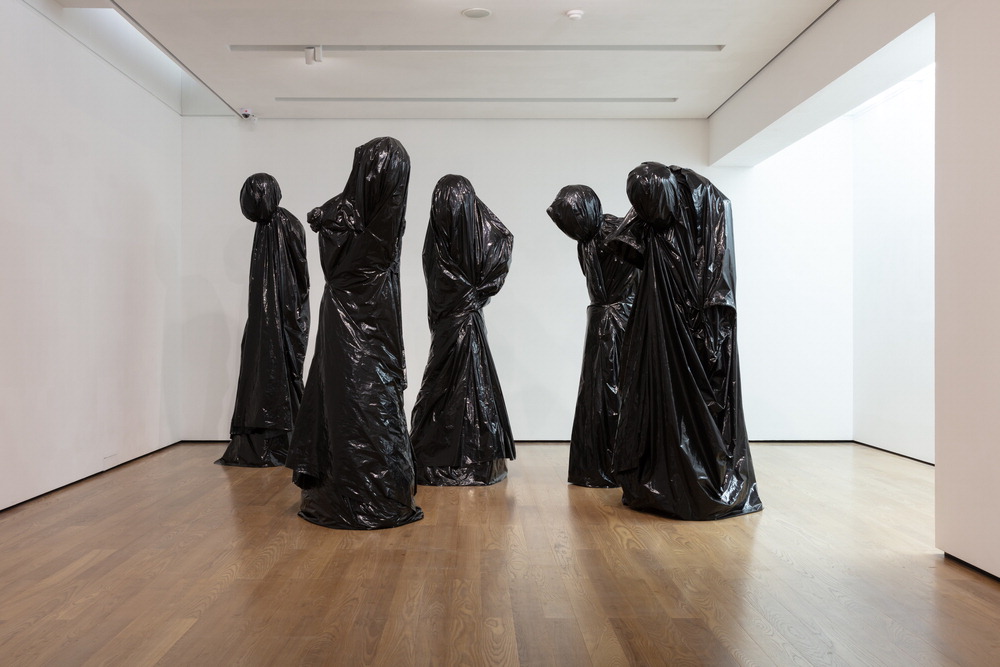 마치 시신을 감싼 듯한 검정 비닐 5개가 나란히 놓여 있다. 그런데 이 검은 덩어리들은 눕혀 있지 않고 세워져 있다. 이미 죽음으로 세상을 떠난 이들의 못다한 이야기가 눈앞에 살아 움직이는 듯하다. 2m가 넘는 거대한 형상으로 보는 이를 압도하지만 공포스럽기보다는 구슬프다. 심승욱 작가의 설치 작품 '지나간 시간 속에 남겨진 5개의 군상'(2024)이다. 언젠가 작가가 뉴스에서 봤던 전쟁 폐허의 한 장면을 작품화한 것이다.