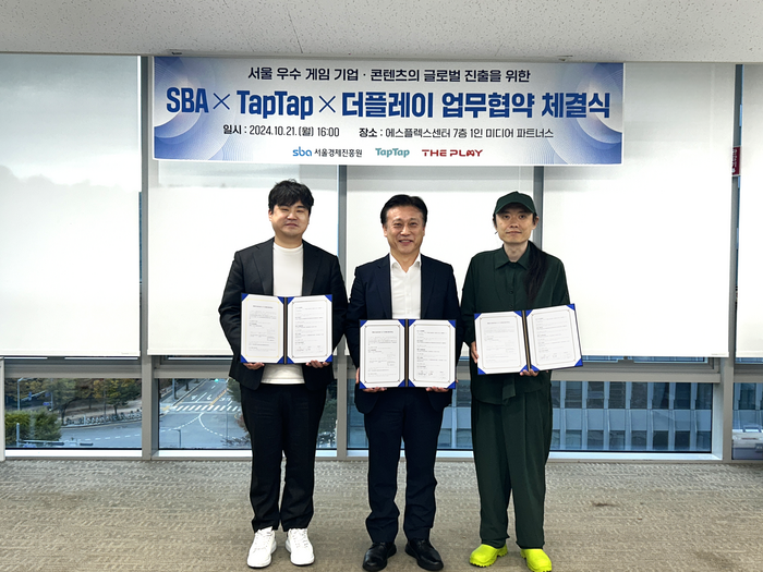 강범준 더플레이 대표(왼쪽부터),김용상 서울경제진흥원 사업부문 이사,장샹 탭탭 대표가 업무 협약 체결 후 기념 촬영을 하고 있다. [사진 = 더플레이] 더플레이는 서울의 우수 게임 기업과 콘텐츠의 글로벌 진출을 지원하기 위해 서울경제진흥원,탭탭(TapTap)과 업무 협약을 체결했다고 25일 밝혔다.