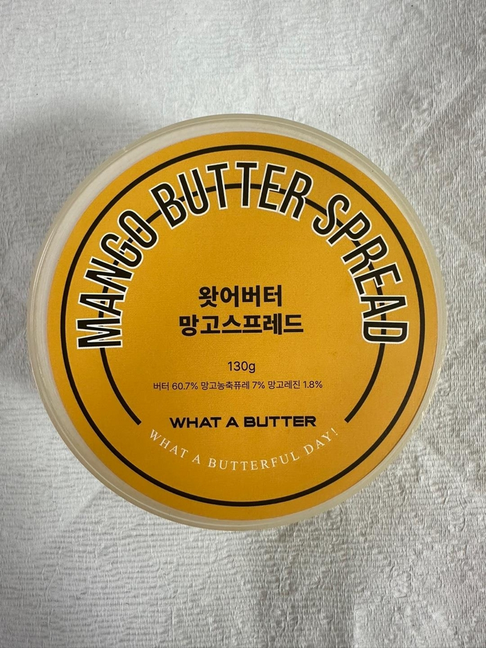 왓어버터 망고스프레드. [사진 출처 = 식품의약품안전처] 식품의약품안전처는 타르 색소가 검출된 가공 버터 제품에 대해 판매 중단·회수 조치한다고 25일 밝혔다.