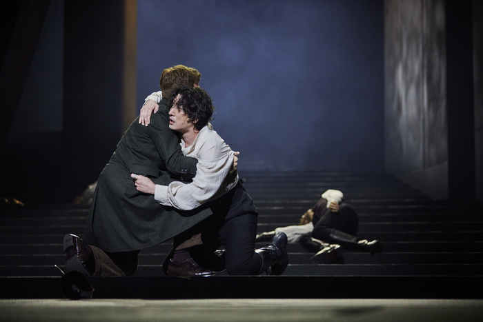 연극‘ 햄릿’의 한 장면. ⓒ예술의전당 세심하게 설계된 무대미술은 위태로운 햄릿의 내면을 시각적으로 강조한다. 앞뒤 폭이 23m에 달하고 계단으로 소실점을 구현한 무대의 깊이감은 그의 고독과 무력감을 표현하는 것처럼 느껴진다. 무대 왼편의 거대한 기둥들은 인간을 압도하는 잔인한 운명을 형상화한 것으로 다가온다.