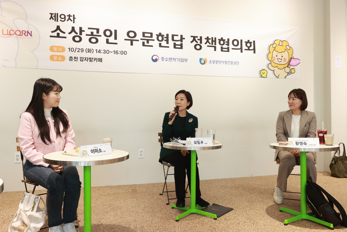 이미소 농업회사법인 밭 대표(사진왼쪽부터)와 오영주 중소벤처기업부 장관,올해 강한소상공인으로 선정된 황영숙 농부창고 대표가 29일 춘천 감자밭에서 열린 ‘제9차 소상공인 우문현답 정책협의회’에 참가해 발언하고 있다.<중소벤처기업부>