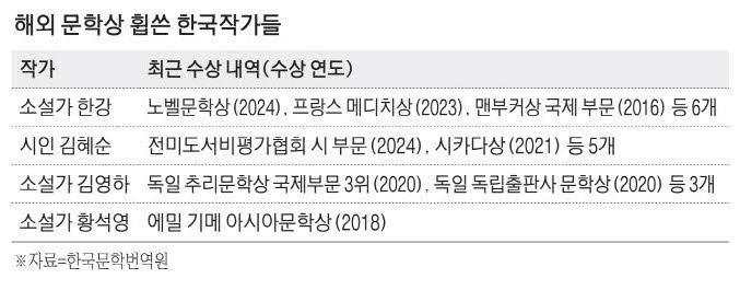 매일경제가 31일 한국문학번역원을 통해 확인한 자료에 따르면 공식 집계를 시작한 2003년 이후 국내 작가들은 주요 해외 문학상을 모두 45개 받았다. 이 가운데 한강 소설가 6개,고은 시인 6개,김혜순 시인 5개,김영하 소설가 3개,신경숙 소설가와 김이듬 시인이 각각 2개로 뒤를 이었다.