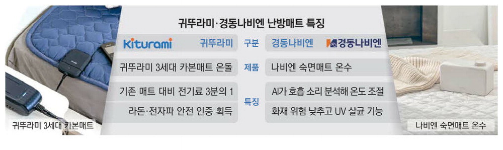 보일러 맞수 귀뚜라미와 경동나비엔이 난방매트로 전선을 넓혀가고 있다. 건설경기 침체로 보일러 수요가 줄며 대체 시장에서 활로를 모색하면서다. 경동나비엔은 인공지능(AI) 기술을 적용한 숙면매트를 내세웠고,귀뚜라미는 전년 대비 카본매트 매출 30% 성장이라는 공격적인 목표를 세웠다.
