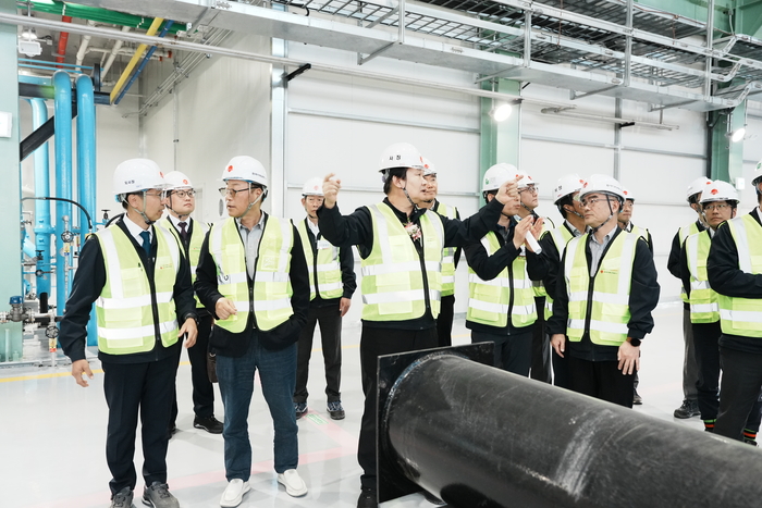 31일 세종시에서 세종누리열원 준공행사가 개최됐다. 정용기 한국지역난방공사 사장(앞줄 세번째)이 세종누리열원 내 열공급시설을 점검하고 있다. <사진=한국지역난방공사> 31일 지역난방공사는 세종시에서 세종누리열원 준공행사를 개최했다. 이 자리에는 정용기 지역난방공사 사장과 임직원,최민호 세종특별자치시장 등 100여명이 참석했다.