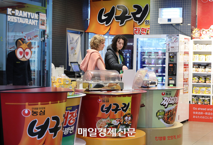 1일 한국을 찾은 외국인 관광객들이 서울의 한 호텔 라면편의 점에서 라면을 고르고있다.