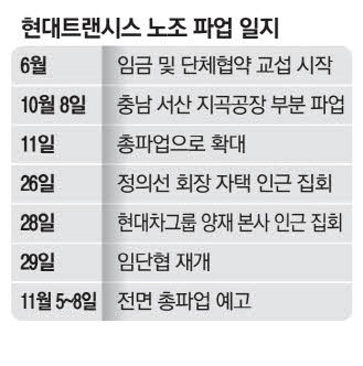금속노조 트랜시스지회는 이날 오전 15차 쟁의대책위원회 회의를 열고 5일부터 8일까지 전면 총파업을 의결했다. 이 노조는 현대차·기아의 서울 양재 본사뿐만 아니라 정의선 현대차그룹 회장의 자택이 위치한 한남동 주택가에서도 산발적으로 시위를 전개하고 있다.