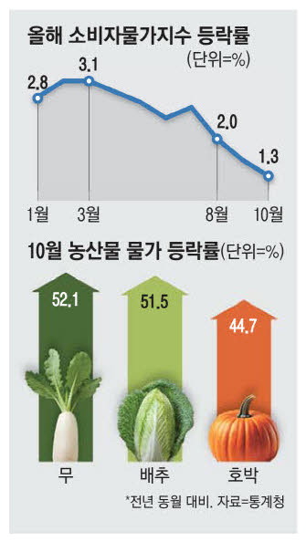 전반적인 물가가 안정세를 이어갔지만 문제는 신선채소 가격이다. 지난달 무,배추 등 신선채소 물가는 전년 동월 대비 15.7%나 뛰었다. 2022년 10월(22.1%) 이후 2년 만에 가장 높은 상승률이다. 체감물가가 여전히 높게 느껴지는 이유다. 김장 주재료인 무(52.1%),배추(51.5%) 가격이 50% 넘게 올랐다. 상추 가격도 49.3% 올랐다. 호박과 토마토 가격도 각각 44.7%,21.3% 뛰었다.